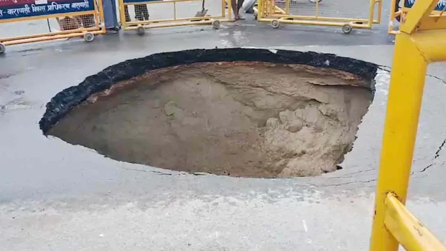 वाराणसी एयरपोर्ट रोड पर 15 फीट गहरा गड्ढा हुआ, पुलिस ने बैरिकेडिंग कर रास्ते को किया बंद