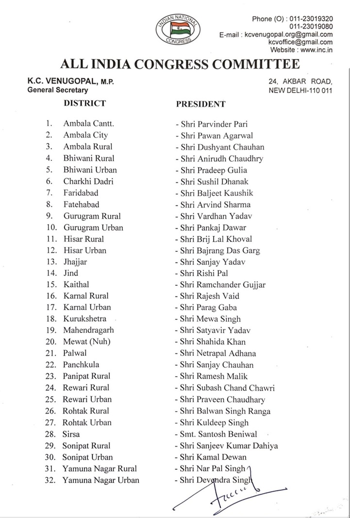 कांग्रेस महासचिव के.सी. वेणुगोपाल ने मंगलवार शाम जिला समिति अध्यक्षों के नामों की घोषणा की। हरियाणा में एक दशक से भी ज़्यादा समय से सत्ता से बाहर कांग्रेस का 11 साल से राज्य में कोई जिला स्तरीय संगठन नहीं है।
