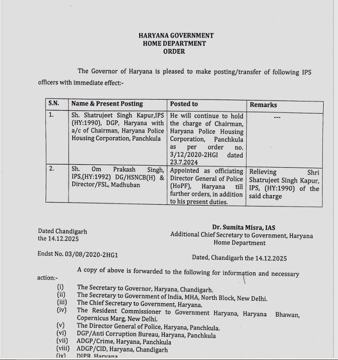 Haryana में बड़ा प्रशासनिक फेरबदल: IPS शत्रुजीत कपूर DGP पद से हटाए गए, ओपी सिंह रहेंगे कार्यवाहक DGP