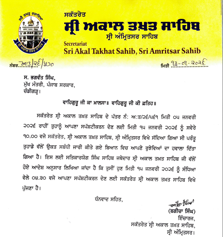 गौरतलब है कि मुख्यमंत्री भगवंत मान ने पहले कहा था कि 15 जनवरी को अमृतसर में राष्ट्रपति द्रौपदी मुर्मु का भी कार्यक्रम प्रस्तावित है, लेकिन वह उसमें शामिल नहीं होंगे और अकाल तख्त में पेश होना प्राथमिकता देंगे। इसी बयान का संज्ञान लेते हुए अकाल तख्त सचिवालय ने पेशी का समय बदलने का निर्णय लिया।