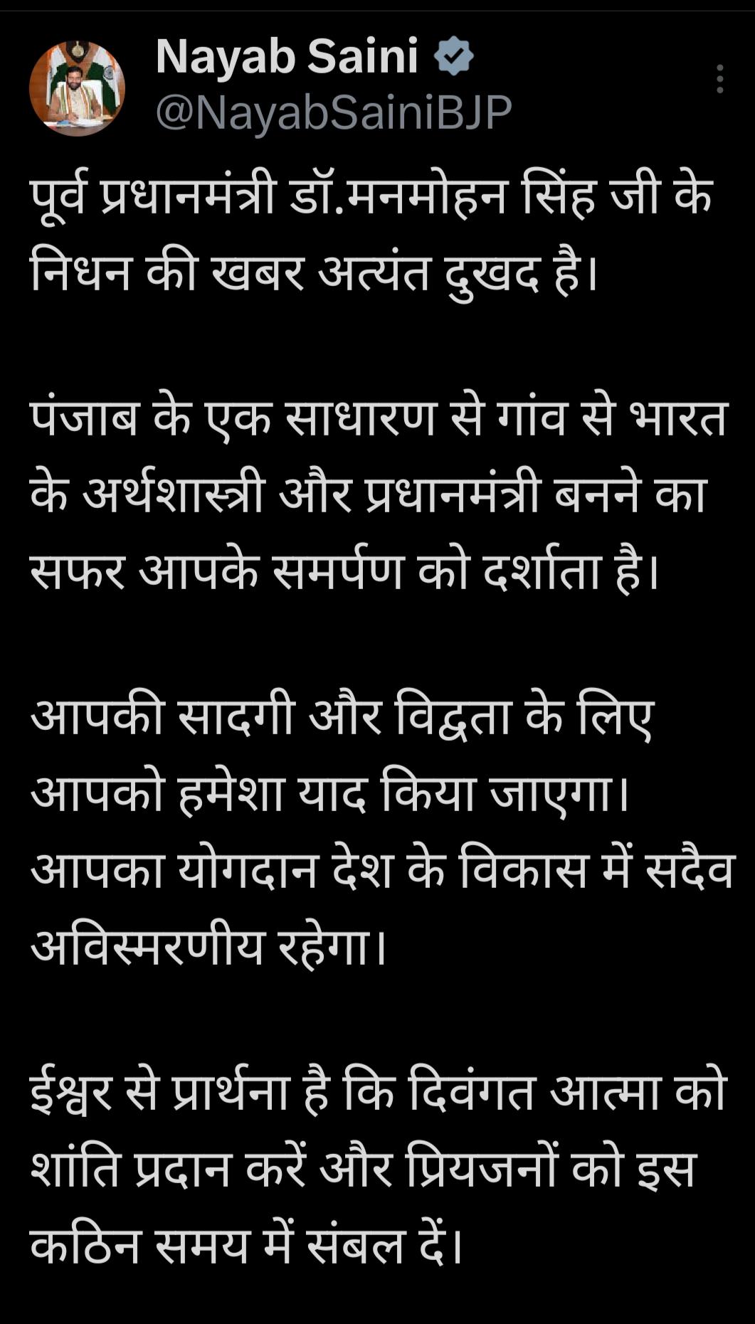 पूर्व प्रधानमंत्री मनमोहन सिंह के निधन के बाद CM नायब सिंह सैनी ने रद्द किए सभी कार्यक्रम