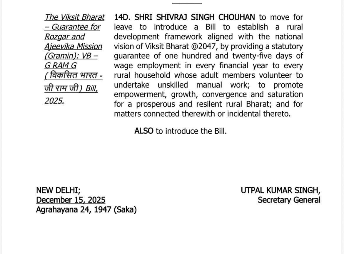 मोदी सरकार ने मौजूदा योजना के नाम को बदलकर ‘विकसित भारत-गारंटी फॉर रोजगार एंड आजीविका मिशन (ग्रामीण) (VB-G RAM G) रखने का प्रस्ताव रखा है।इससे पहले 12 दिसंबर को खबर आई थी कि केंद्रीय कैबिनेट ने ‘मनरेगा’ का नाम बदलकर पूज्य बापू ग्रामीण रोजगार योजना रखा है। हालांकि, सरकार की ओर से जारी नोटिफिकेशन सामने नहीं आया था।