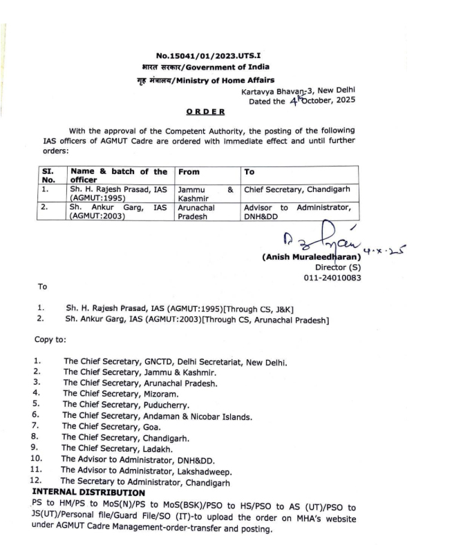बता दें कि इससे पहले आईएएस अधिकारी राजेश प्रसाद जम्मू-कश्मीर के मुख्य सचिव के पद पर कार्यरत थे, वहीं चंडीगढ़ में तैनात राजीव वर्मा को दिल्ली ट्रांसफर कर दिया गया है।