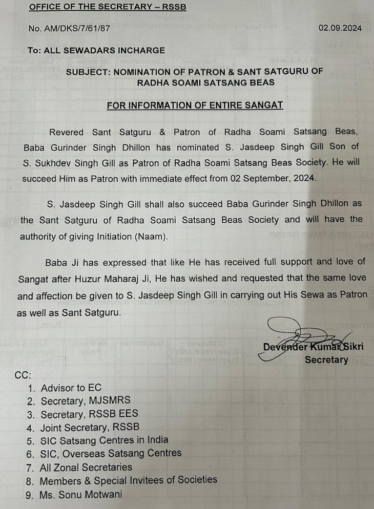 जसदीप सिंह गिल राधा स्वामी सत्संग ब्यास सोसाइटी के संत सतगुरु के रूप में बाबा गुरिंदर सिंह ढिल्लों की जगह लेंगे और नाम दीक्षा देने का अधिकार उनके पास होगा।