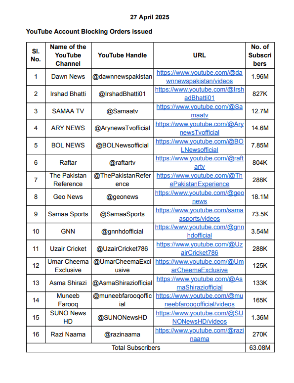 अधिकारियों ने सोमवार को बताया कि भारत, उसकी सेना और सुरक्षा एजेंसियों के खिलाफ कथित तौर पर भड़काऊ और सांप्रदायिक रूप से संवेदनशील सामग्री के साथ-साथ झूठे और भ्रामक बयान प्रसारित करने के लिए सोलह पाकिस्तानी यूट्यूब चैनलों को ब्लॉक कर दिया गया है। सरकार ने पहलगाम त्रासदी पर अपनी रिपोर्टिंग में आतंकवादियों को “उग्रवादी” कहने के लिए बीबीसी को भी चेतावनी जारी की है।