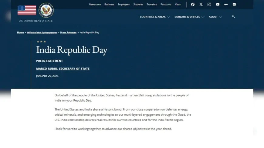 26 जनवरी को मनाए जा रहे भारत के गणतंत्र दिवस के अवसर पर रविवार को जारी अपने संदेश में रुबियो ने कहा कि “अमेरिका के लोगों की ओर से मैं भारत के नागरिकों को उनके गणतंत्र दिवस पर हार्दिक शुभकामनाएं देता हूं।”