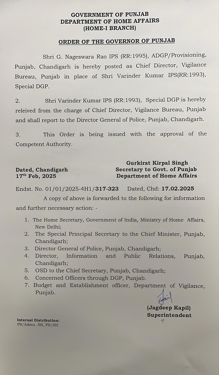 पंजाब सरकार ने 17 फरवरी 2025 को एक महत्वपूर्ण प्रशासनिक फेरबदल करते हुए आईपीएस अधिकारी जी. नागेश्वर राव को पंजाब विजिलेंस ब्यूरो का नया प्रमुख नियुक्त किया है। वह पूर्व प्रमुख वरिंदर कुमार की जगह लेंगे, जिन्हें इस पद से हटा दिया गया है। यह निर्णय तब लिया गया जब मुख्यमंत्री भगवंत सिंह मान ने सभी विभागों के प्रमुखों के साथ एक बैठक की, जिसमें भ्रष्टाचार के खिलाफ सख्त कार्रवाई की आवश्यकता पर चर्चा की गई थी।