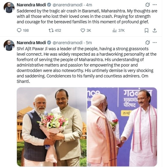 “महाराष्ट्र के बारामती में हुए इस दुखद विमान हादसे से अत्यंत पीड़ा हुई है। जिन परिवारों ने अपने प्रियजनों को खोया है, उनके प्रति मेरी संवेदनाएं हैं। ईश्वर इस कठिन समय में उन्हें संबल प्रदान करें।”