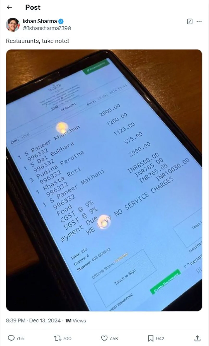आपको बता दें कि खाने में पांच आइटम शामिल थे – पनीर खुरचन, दाल भुखरा, पनीर मखनी के साथ कुरकुरी रोटी और पुदीना परांठा – जिनकी कीमत बहुत ज्यादा थी, शर्मा ने कुल कीमत के नीचे छपे “नो सर्विस चार्ज” नोट को हाईलाइट किया। शर्मा ने अपनी पोस्ट में लिखा, “रेस्टोरेंट वालों, ध्यान दें!” इसके अलावा ईशान ने सोशल मीडिया पर रेस्टोरेंट के मेन्यू की तस्वीर भी पोस्ट की जिसमें खाने के दाम आसमान छू रहे थे।
