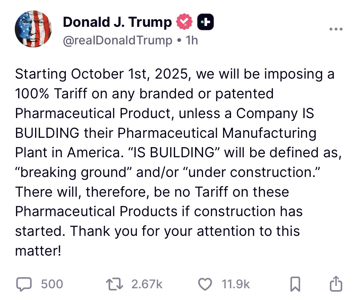 अमेरिका ने 1 अक्टूबर 2025 से ब्रांडेड और पेटेंटेड दवाइयों (फार्मास्यूटिकल प्रोडक्ट्स) पर 100% टैरिफ लगाने की घोषणा की है। यह टैरिफ उन कंपनियों पर लागू होगा जो अमेरिका में फार्मास्यूटिकल निर्माण संयंत्र नहीं बना रही हैं या निर्माण शुरू नहीं किया है। जो कंपनियां अमेरिका में दवा उत्पादन संयंत्र बन रही हैं, उन पर यह टैरिफ नहीं लगेगा।